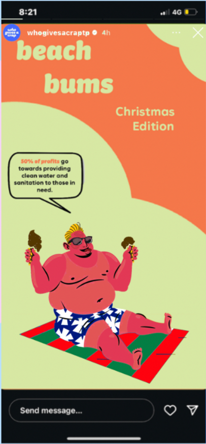 Who Gives a Crap’s key selling point lies in its purpose-driven model, donating 50% of profits to build toilets and improve sanitation in developing countries. But it’s not all serious business; the brand is known for its cheeky, irreverent tone that makes toilet paper fun. Our “Beach Bums” campaign taps into that signature humour while celebrating distinctly Australian summer traditions. Instead of the usual winter-themed Christmas, we embrace a sunny, sandy season filled with playful “beach bum” characters inspired by iconic Aussie personalities you’d spot at the beach.